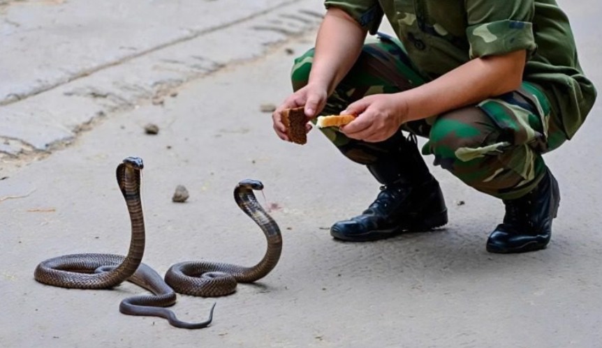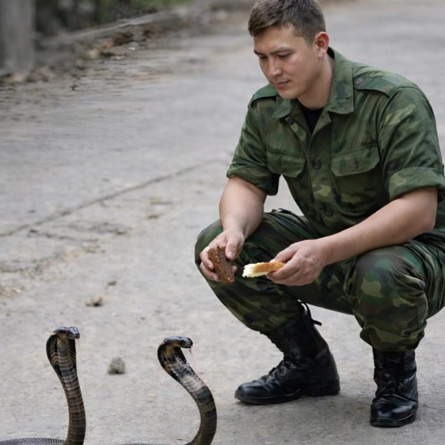 Млад войник, докато копаеше окоп на ръба на лагера, забеляза две малки змийчета, промъкващи се из нагретите от слънцето камъни. Военните инструкции заповядваха такива същества да бъдат унищожавани незабавно за безопасността на личния състав. Но младият мъж не можа да се отърве от любопитството и милостта към тези малки създания. Той започна да ги храни всеки ден с парченца хляб и месо, превръщайки опасното съседство в тайно забавление – неговата малка, невинна игра по време на скучните дни в полевите условия.