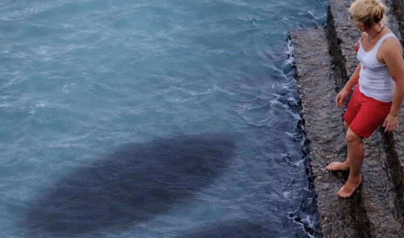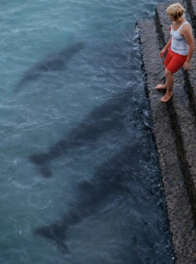 Жената се спусна по стълбите до самия ръб на водата, за да застане в магическа поза за снимка. В този момент усети под водата студено и хлъзгаво докосване. Нещо леко се опря в крака ѝ и изчезна мигновено в дълбочината. Жената застина на място, сърцето ѝ биеше като лудо, докато за няколко секунди се опитваше да осъзнае какво се случва. Точно тогава страховитите сенки на повърхността разкриха цялата истина.